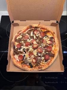 Kävimme vetämässä pizzat ja pakko sanoa, että oli hyvä ja rapea pizzapohja ja täytteitä reilusti. Iso suositus täältä.