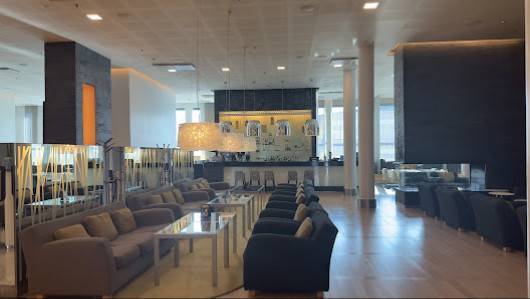 Food a bit uneven. Steak and fries were delicious and perfectly cooked. Salmon was ok, a bit bland and Caesar salad was soggy and unpleasant. Menu lacked lighter fare choices and very limited vegetarian choices. Staff was lovely but wait for food and check was long for crowdsize and space was nice if drafty. Expensive for what it was, but that's the airport!